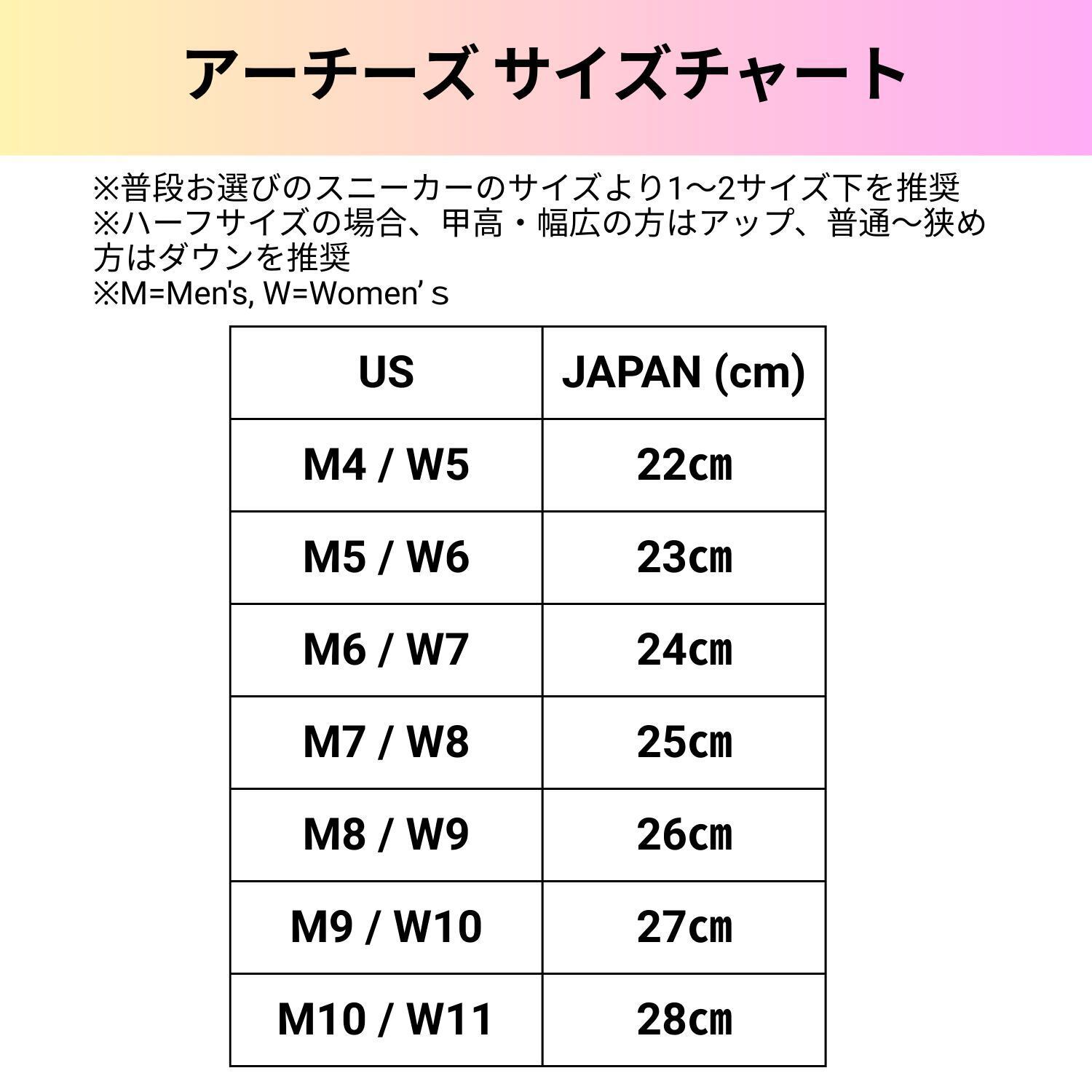 普段お選びのスニーカーサイズより1サイズダウンを推奨。