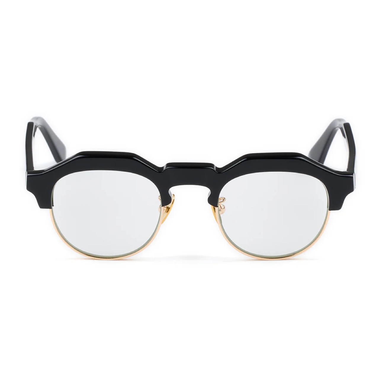 クラウンパント型のブローラインに、彫金を施したアンダーリムを配すことにより、武骨さの中に気品が見える仕上がりに。