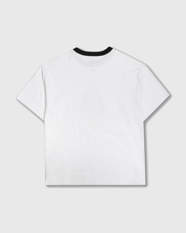 クラシックなリンガーデザインを採用し、襟はコントラストカラーで仕上げたアクセントの効いた一枚。フロントにはヴィンテージライクなグラフィックを落とし込み、シンプルながら存在感のあるデザインに仕上げています。