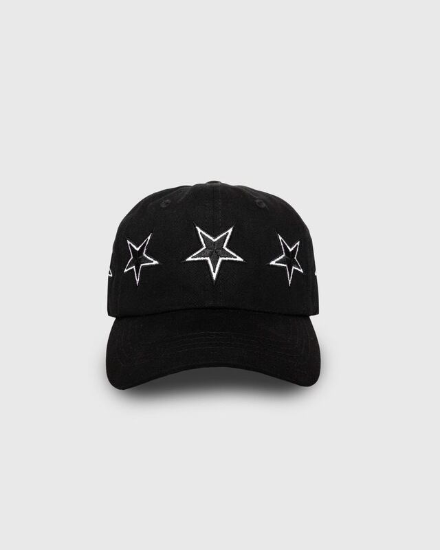 ブラックボディをベースに、フロントからサイド、バックにかけて刺繍を施した存在感のあるデザイン。立体感のある星モチーフやロゴ刺繍が、スタイリングに程よいアクセントを加えます。
